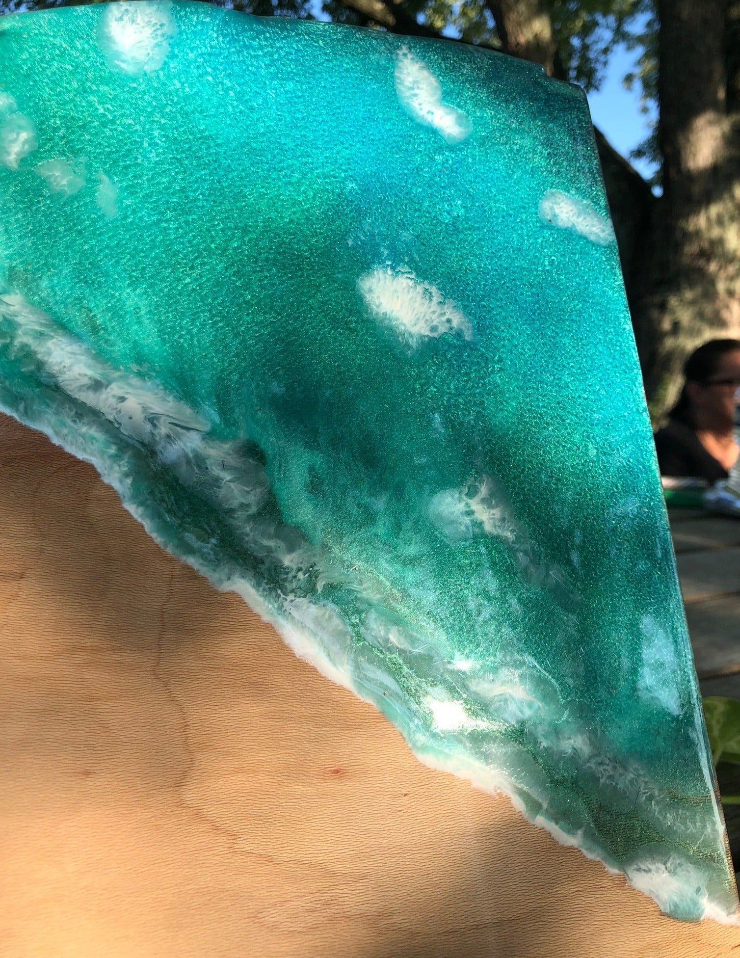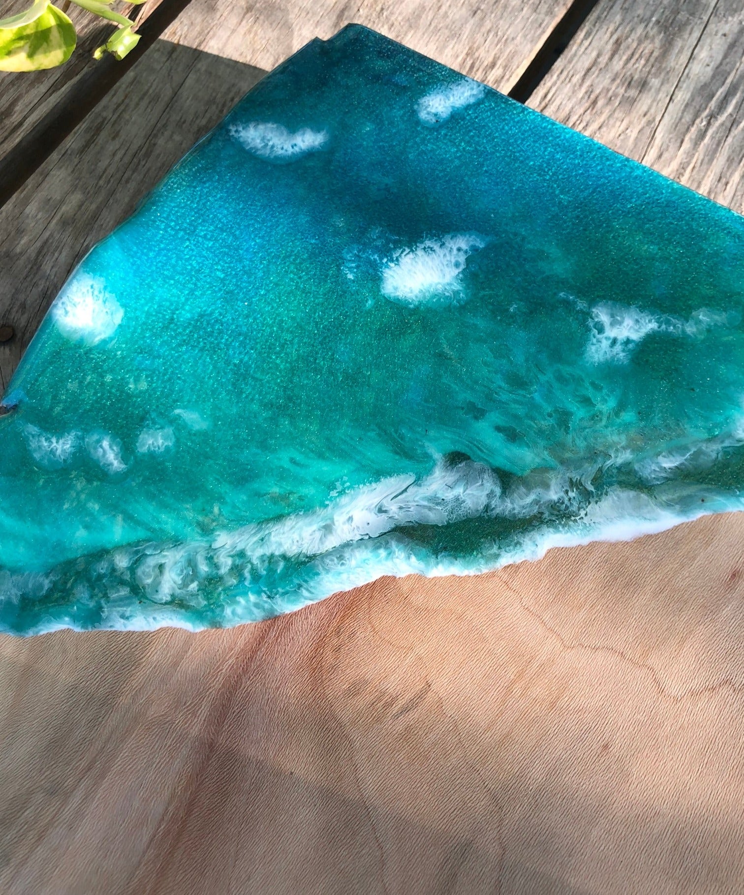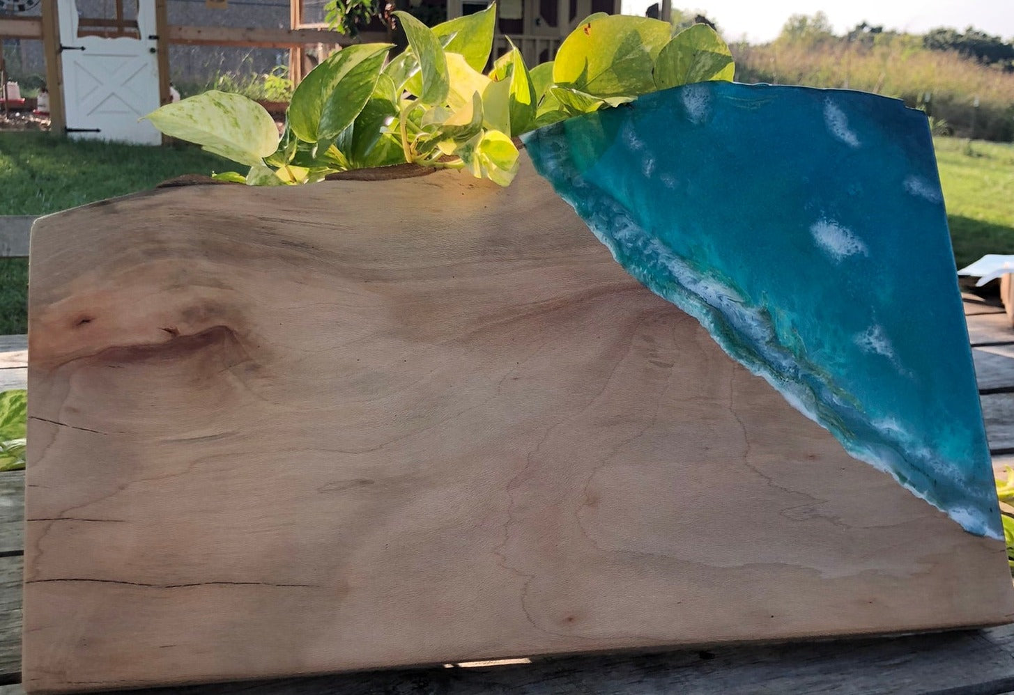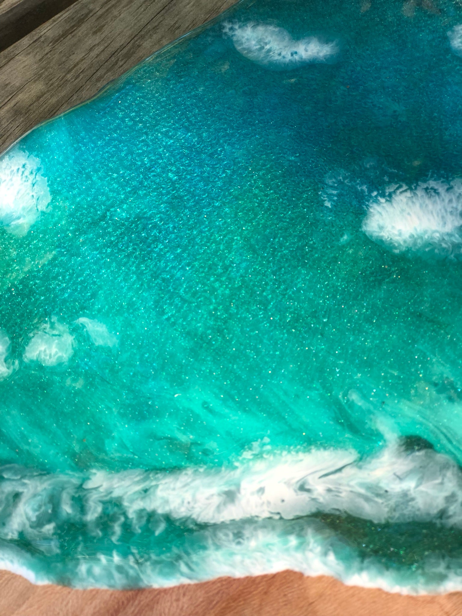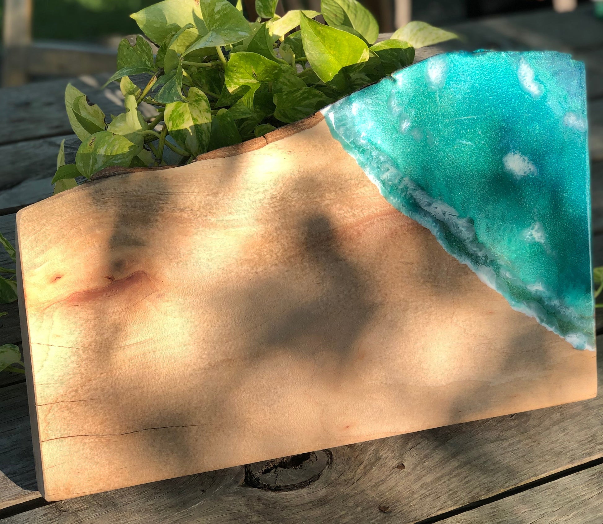 This Charcuterie/Serving Board is beautifully hand-sanded and artistically decorated with the gentle waves of the Caribbean Sea in mind. Imagine the soft waves caressing your soul as you serve beautiful meats and cheeses to your guests and family. Truly a one of a kind piece of functional art. You can choose to display your culinary creations on either side of these boards, as they are equally sanded and sealed.