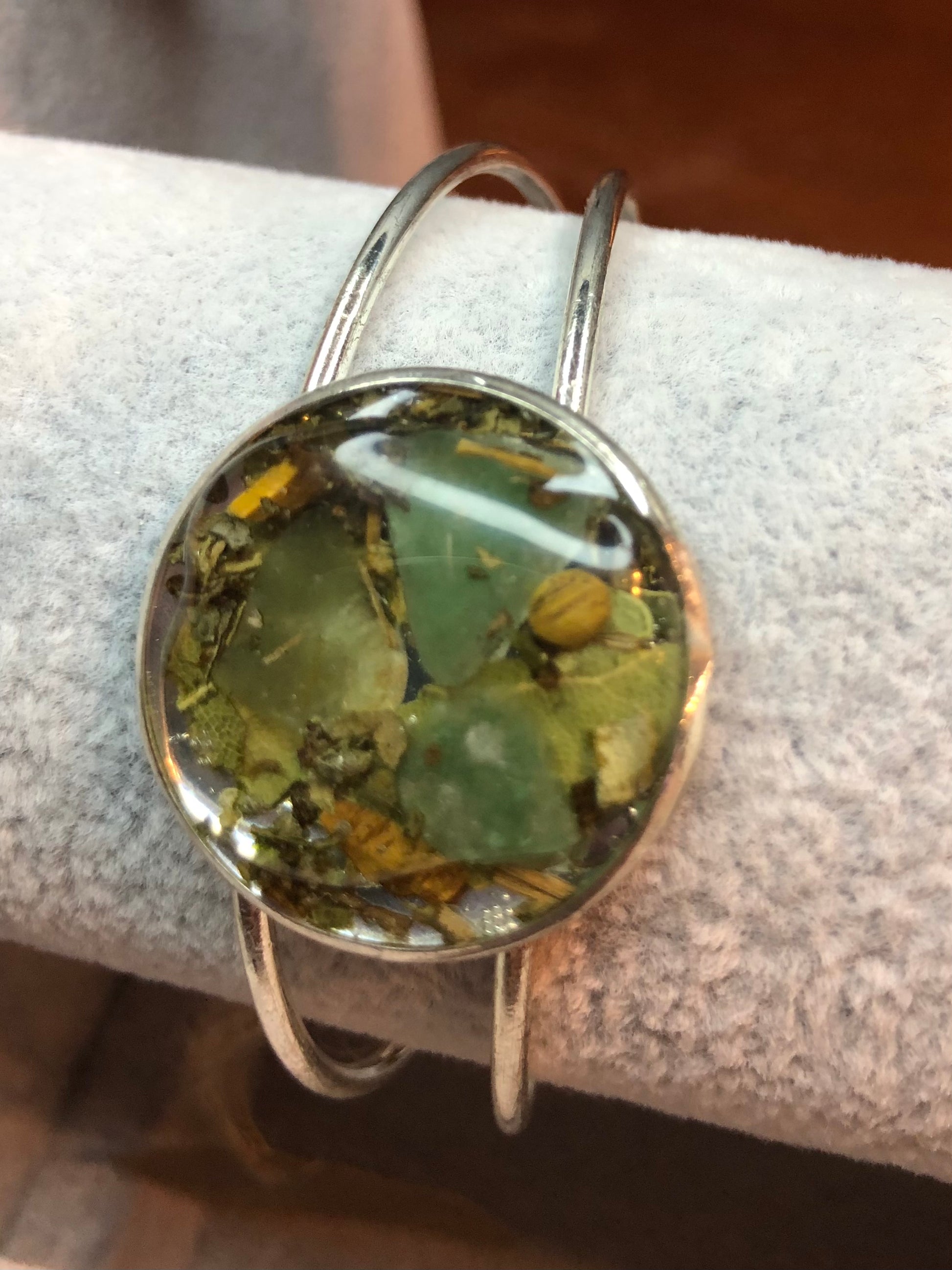 Beautifully hand crafted and set into epoxy resin into a metal cuff Bracelet. Gorgeous and timeless one-of-a-kind piece.