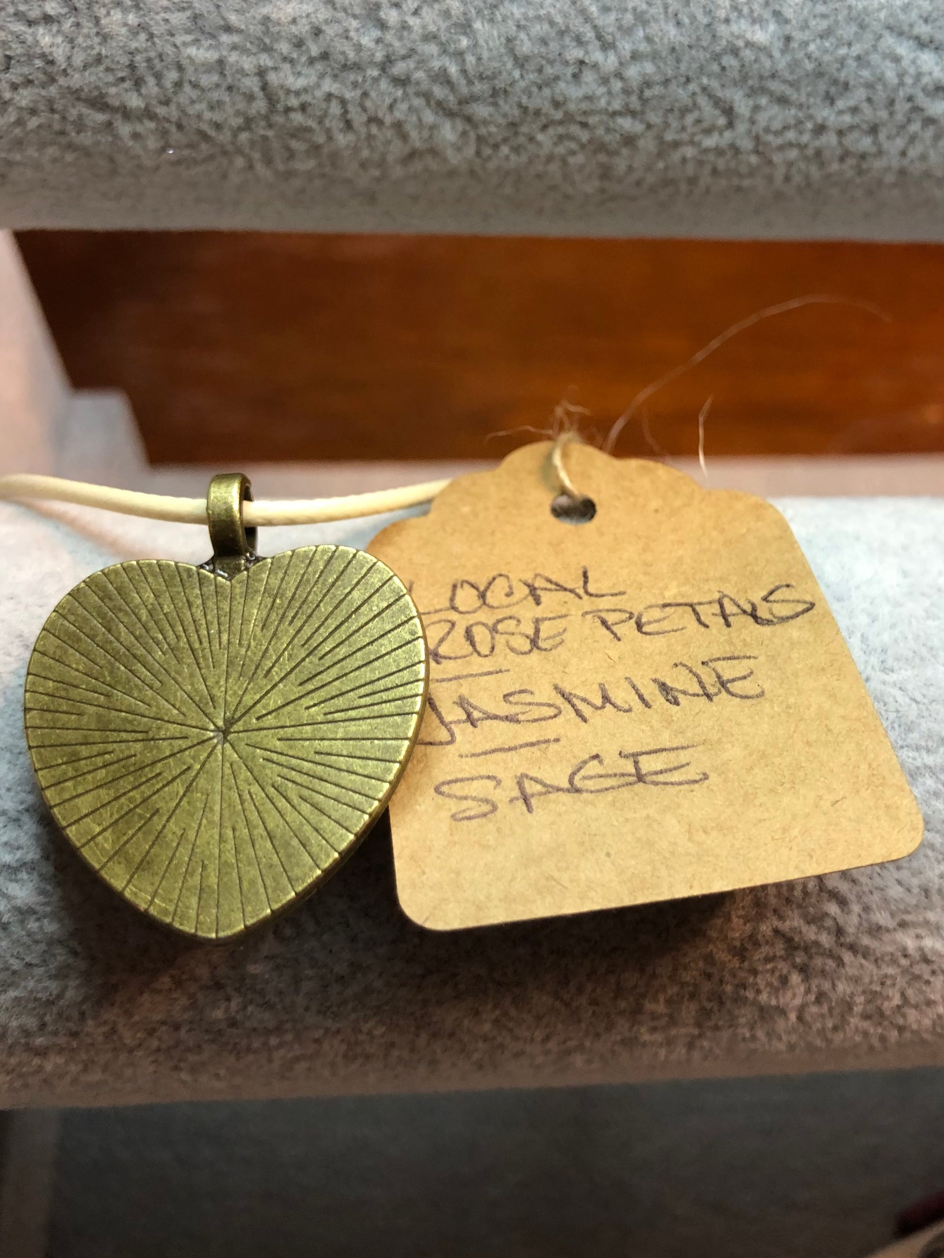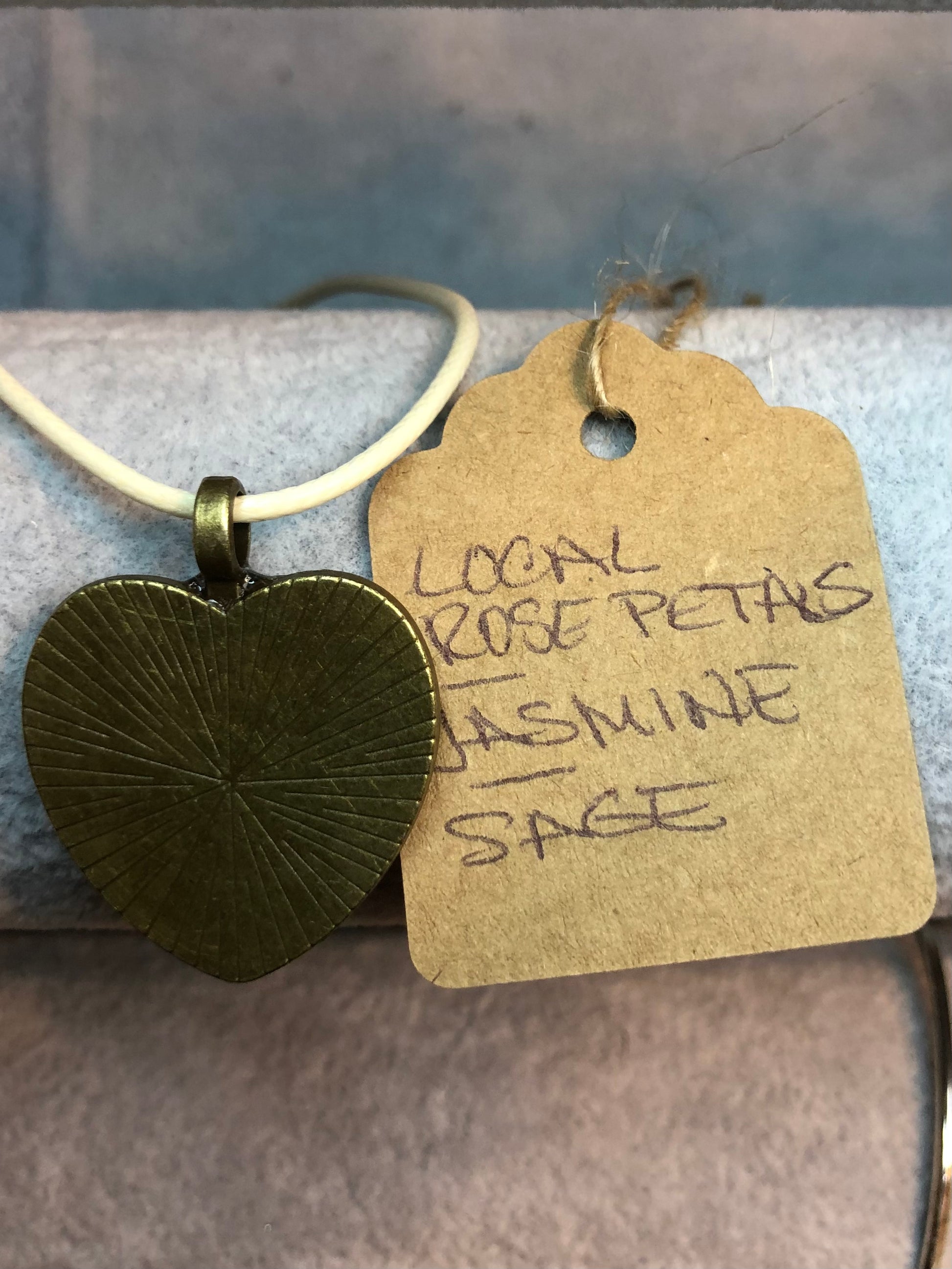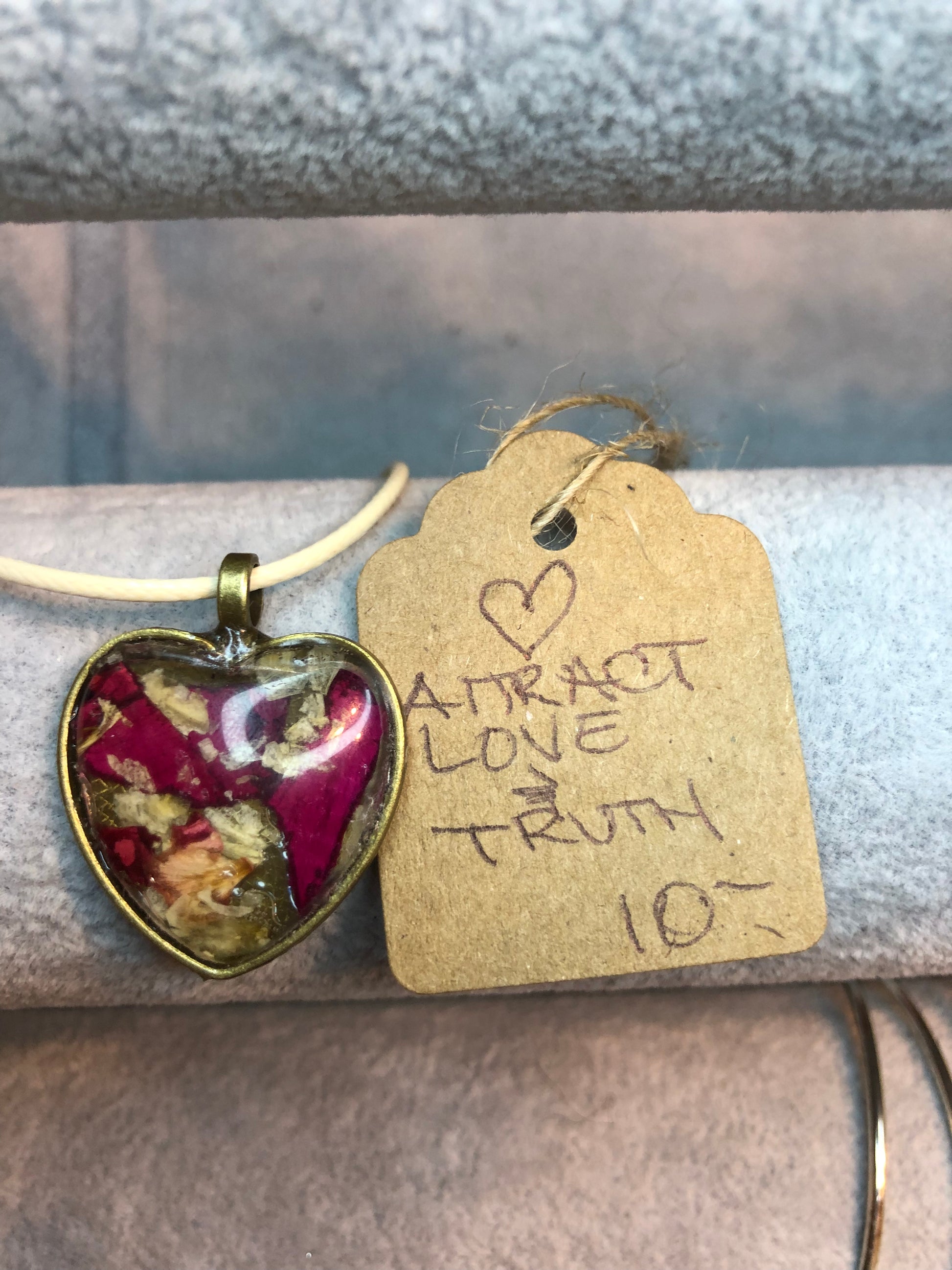 The tag shows the specific ingredients that are set into resin to send it’s messages to the universe.