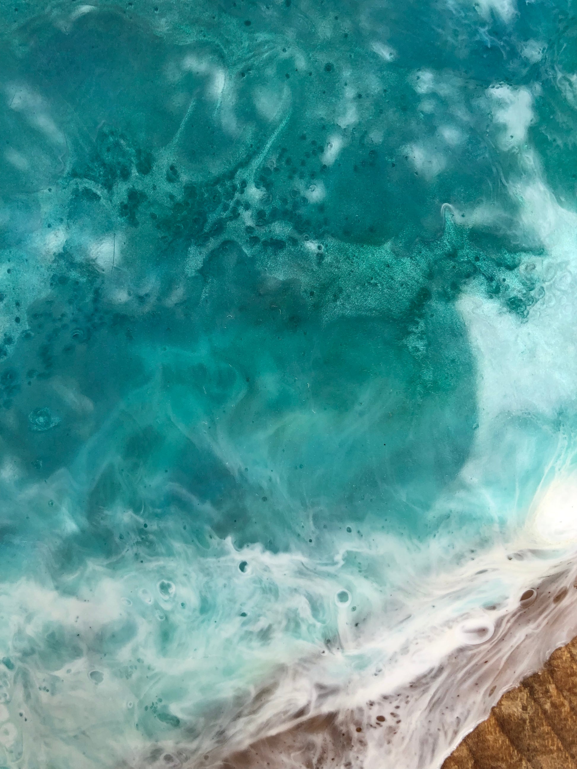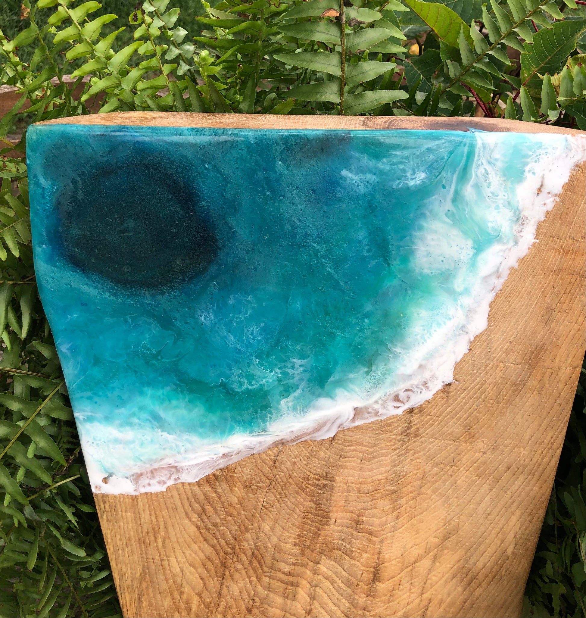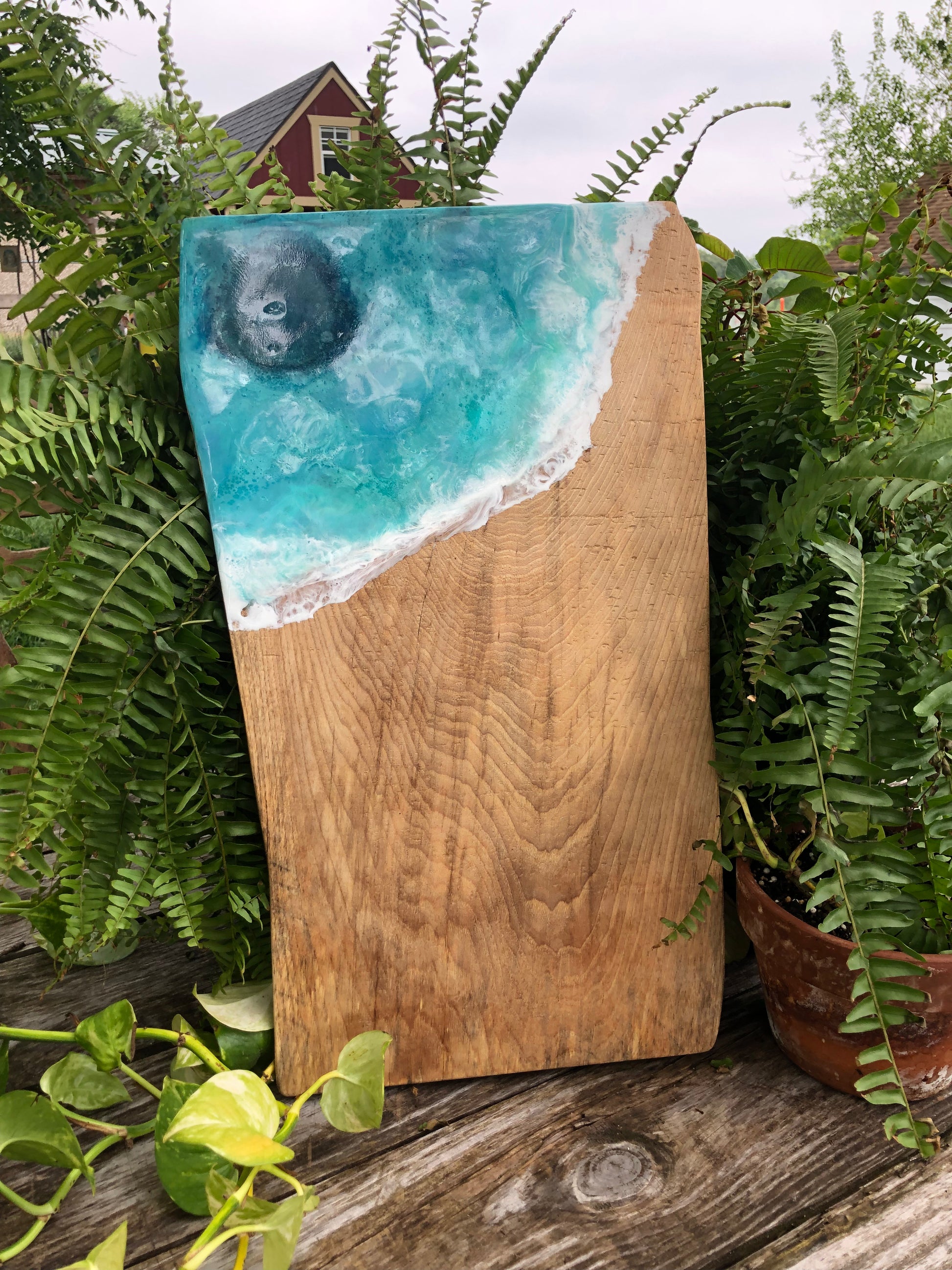 This Charcuterie/Cutting Board is beautifully hand-sanded and artistically decorated with waves of beautiful ocean colors. Truly a one of a kind piece of functional art. You can choose to display your culinary creations on either side of these boards, as they are equally sanded and sealed. This particular board may be used for cutting on the reverse side.