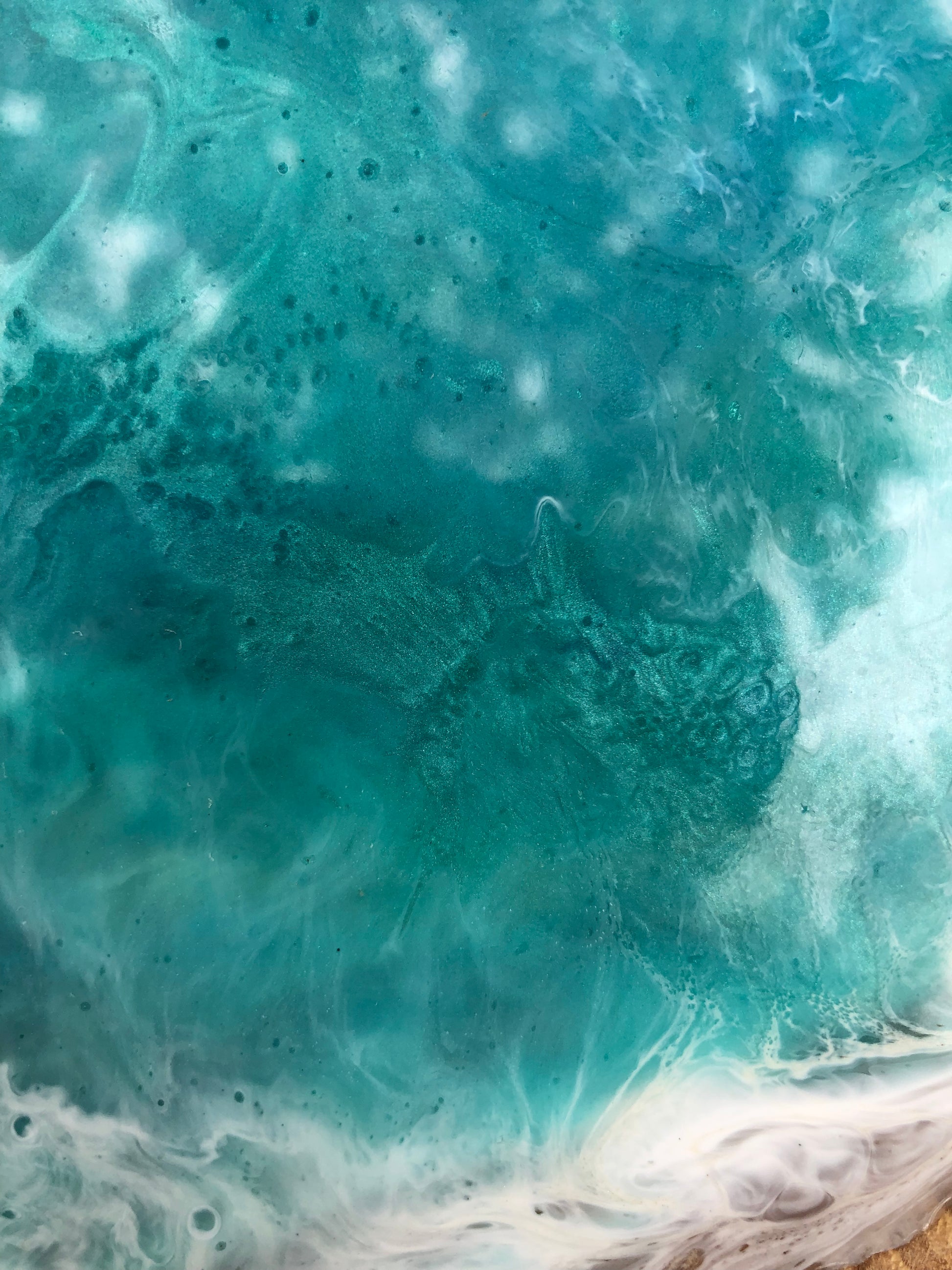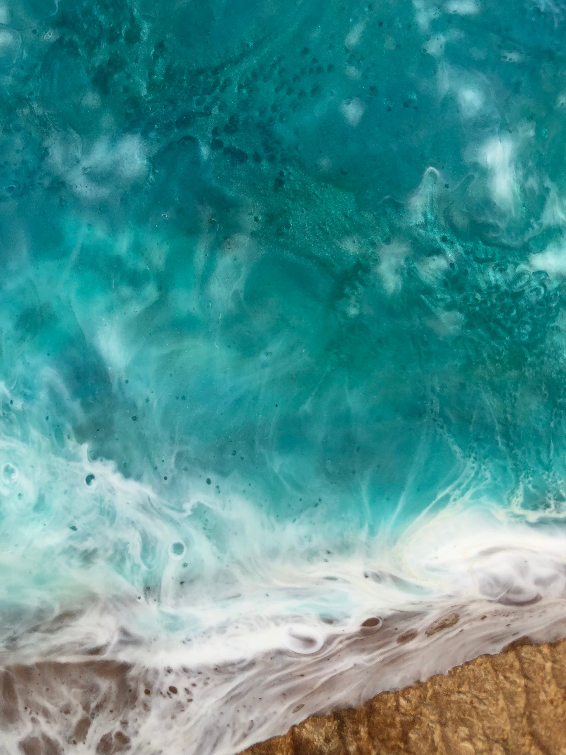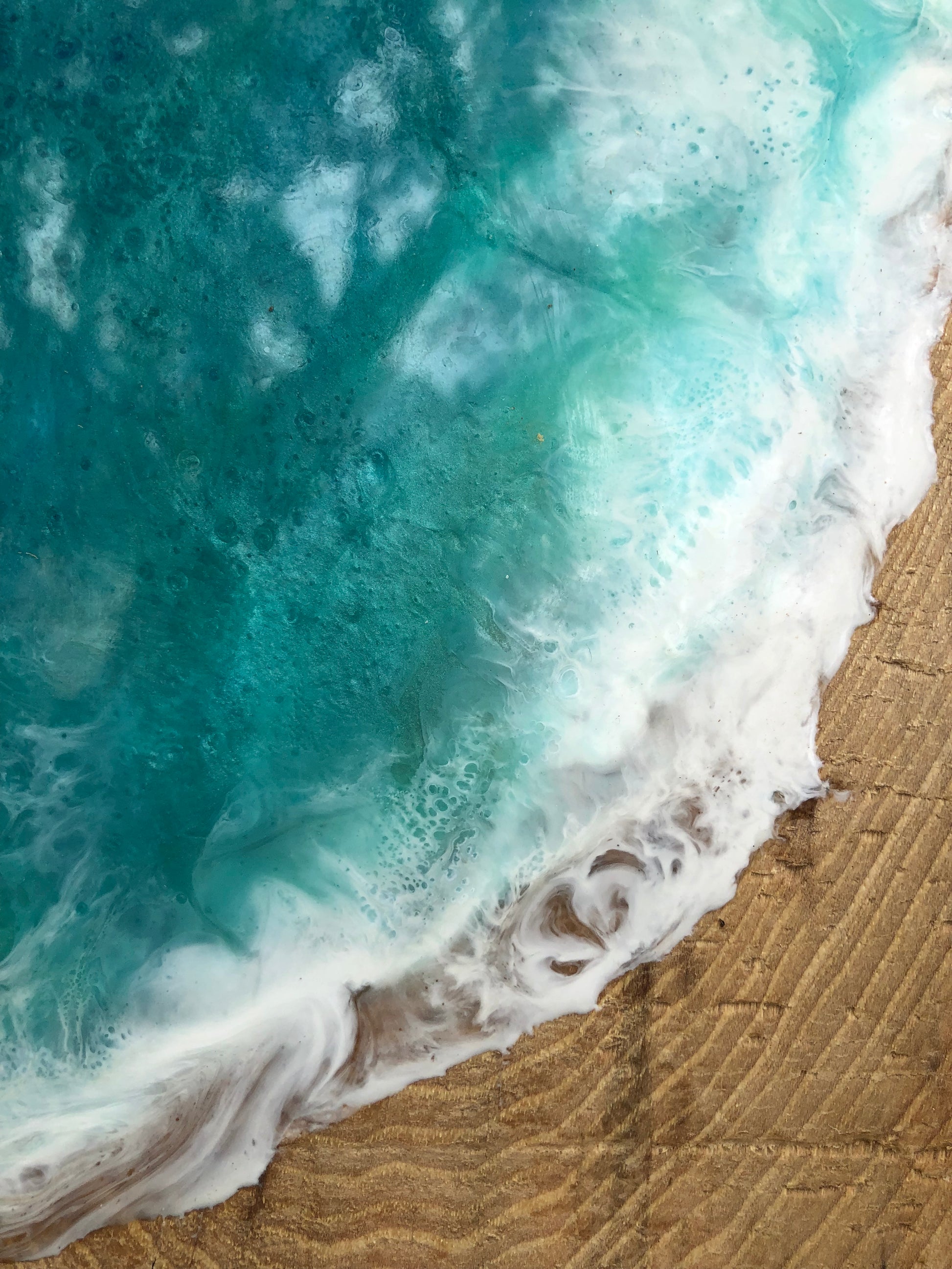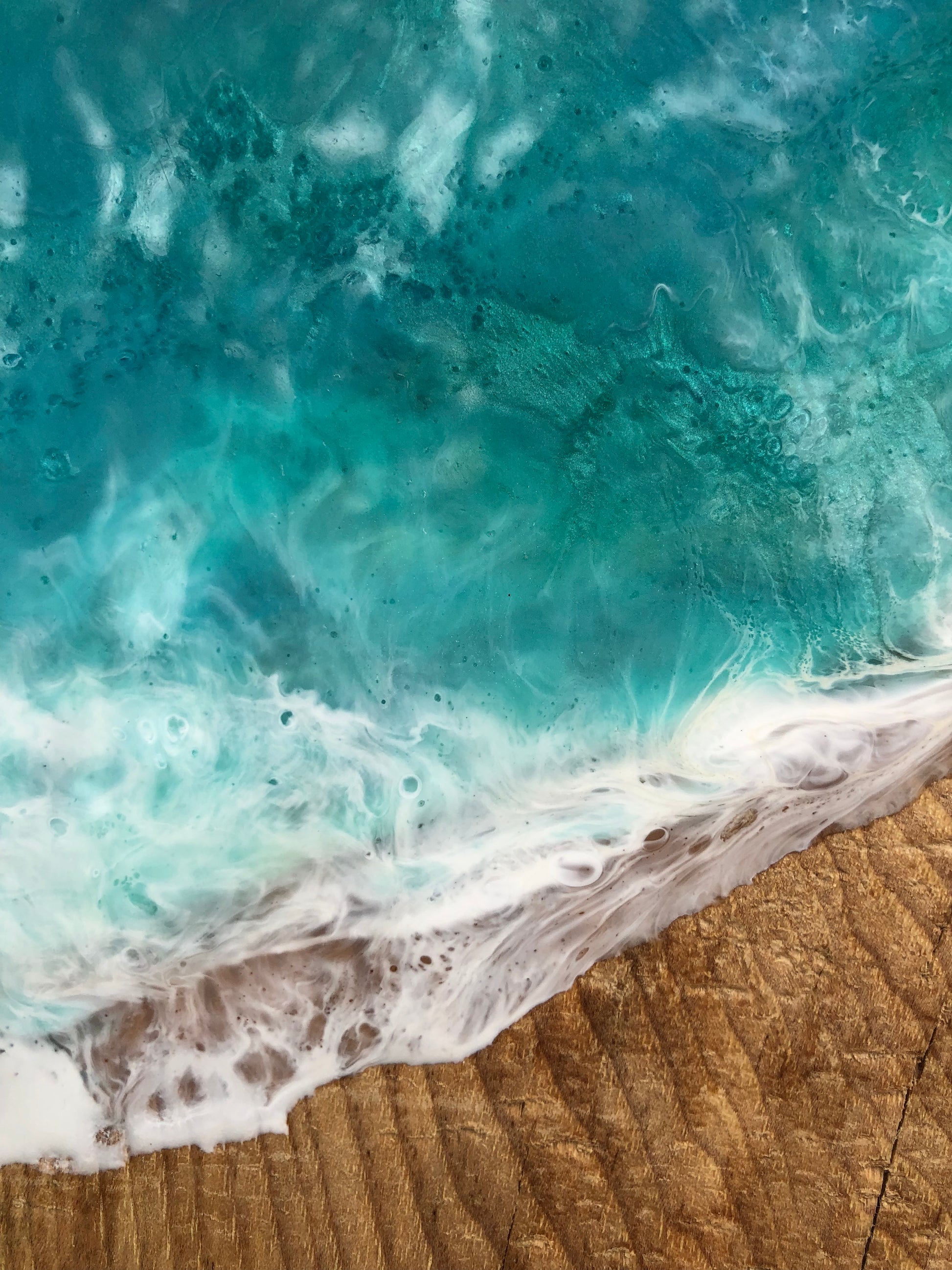 This Charcuterie/Cutting Board is beautifully hand-sanded and artistically decorated with waves of beautiful ocean colors. Truly a one of a kind piece of functional art. You can choose to display your culinary creations on either side of these boards, as they are equally sanded and sealed. This particular board may be used for cutting on the reverse side.