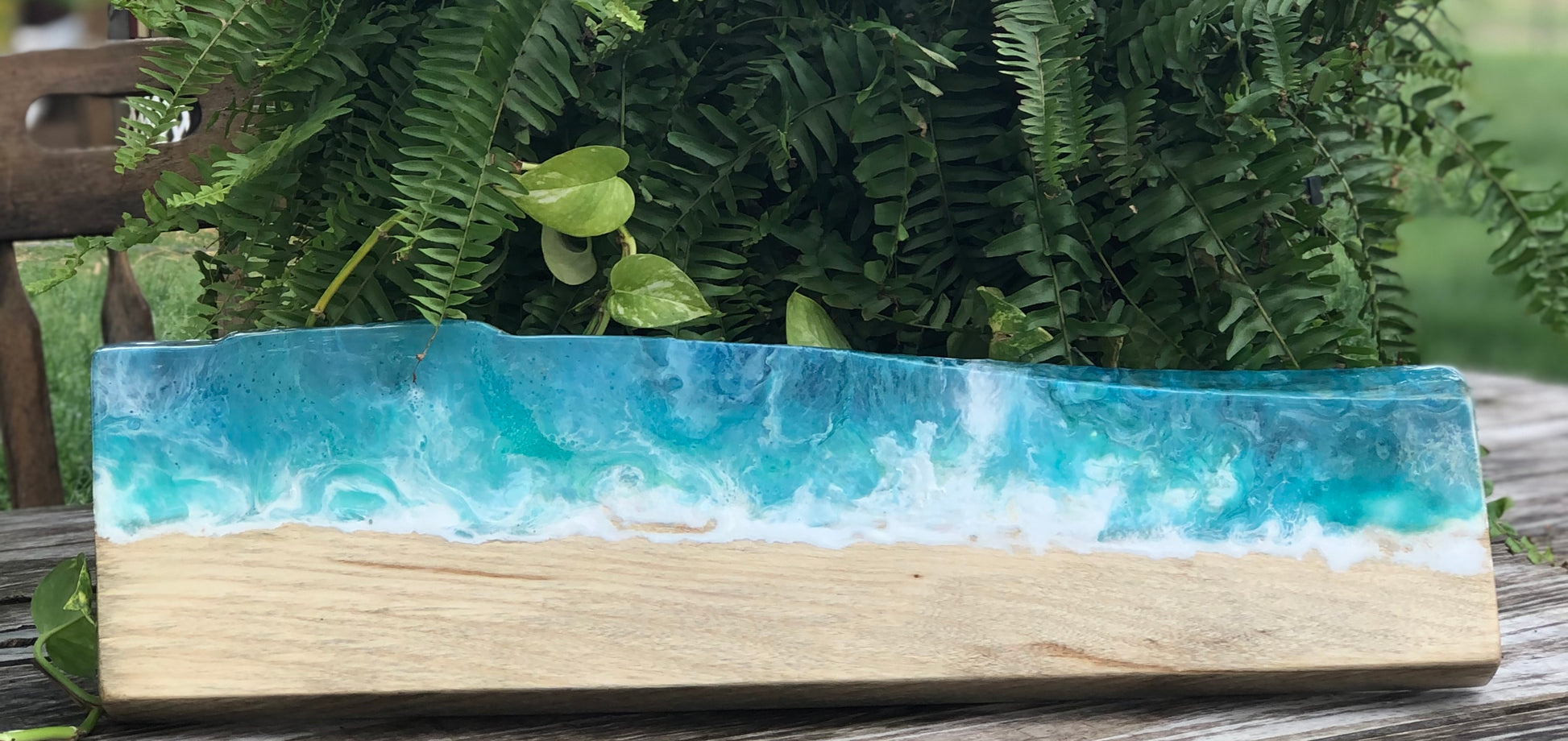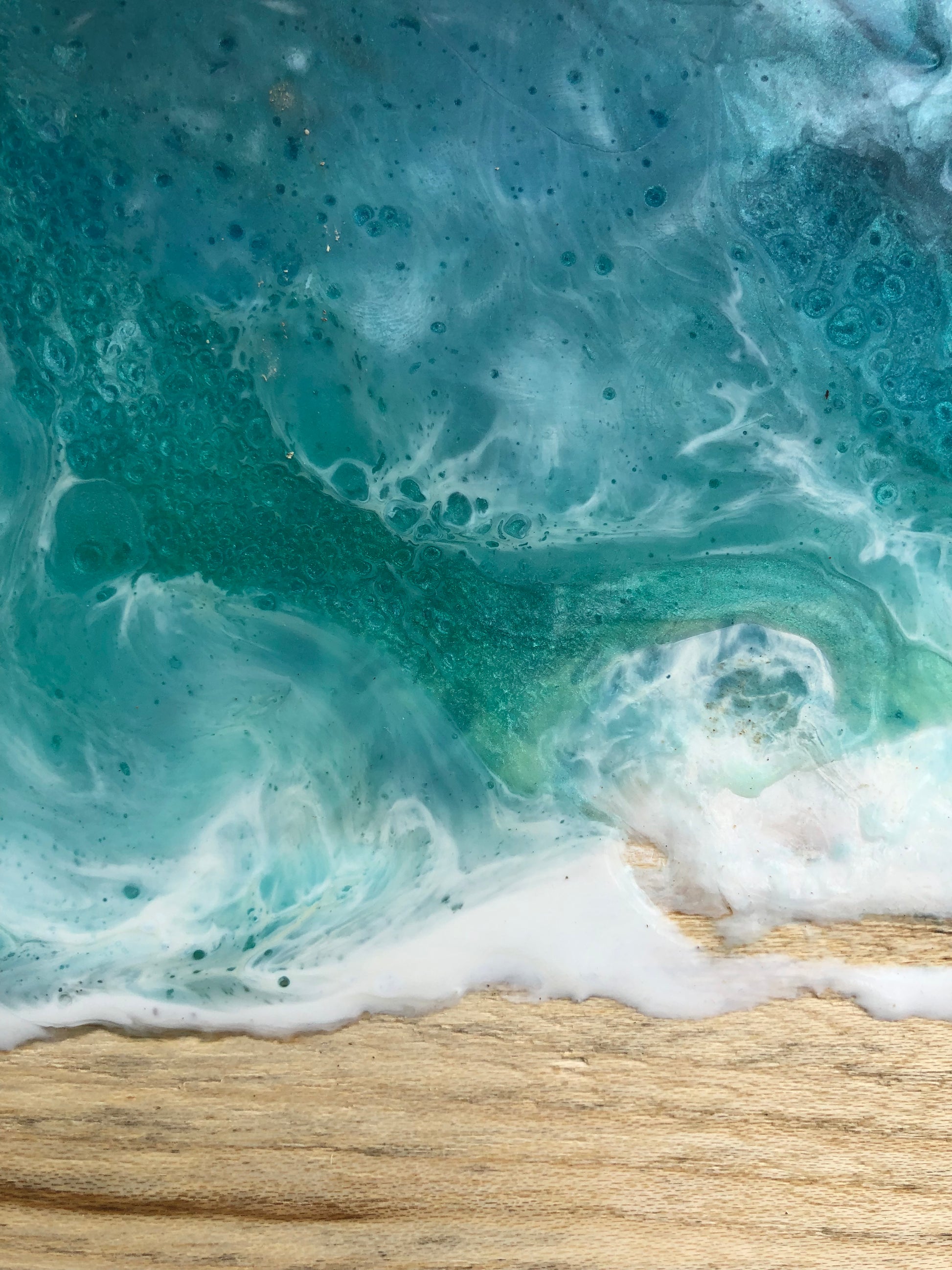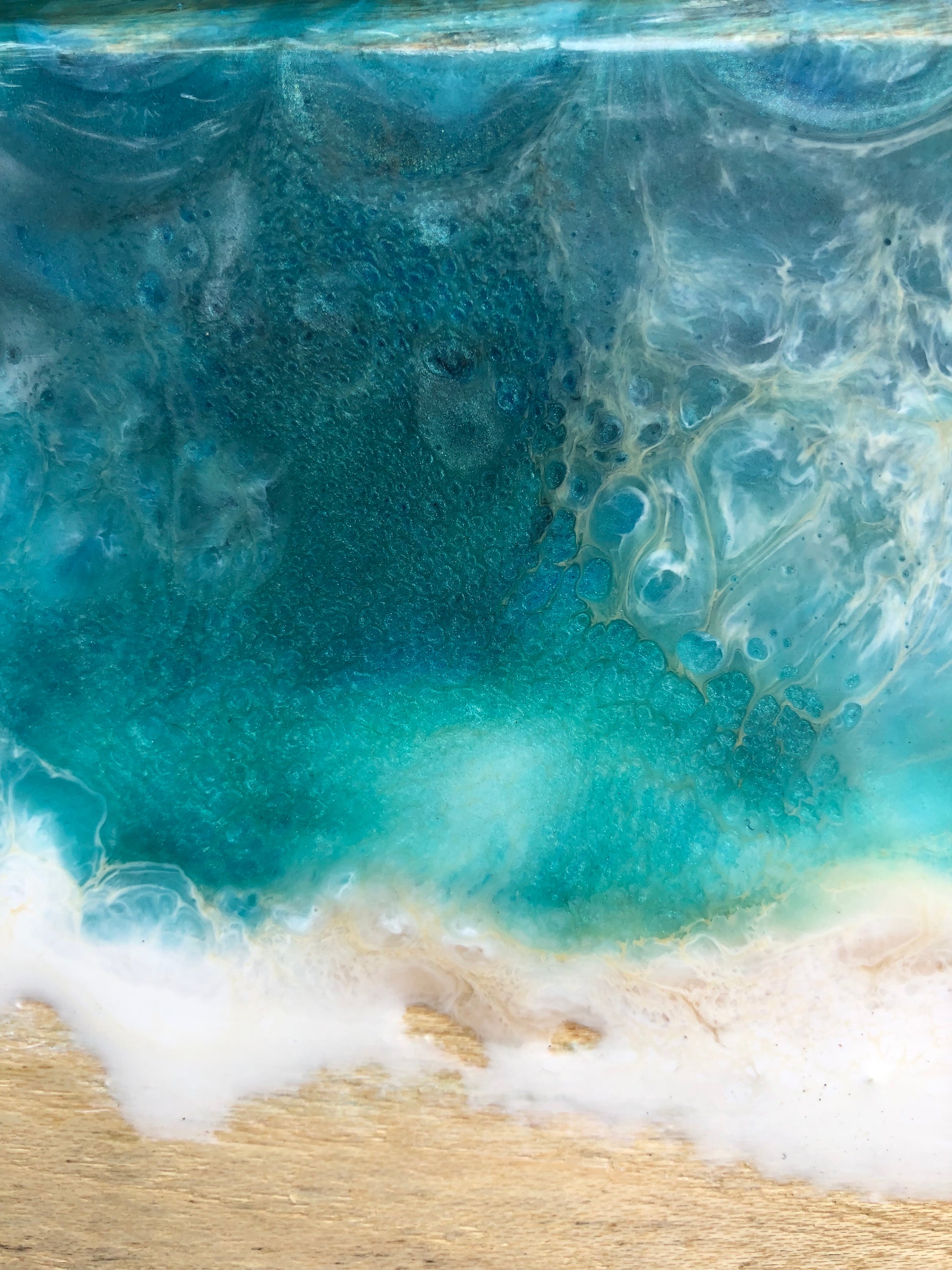 This board is a show-stopper….people who see it in person are stating that they can picture themselves on this beach. They say that they can LITERALLY feel the ocean. I tried a new technique on this, where the waves have some texture instead of laying completely flat and glossy. This is a beautiful conversation piece.